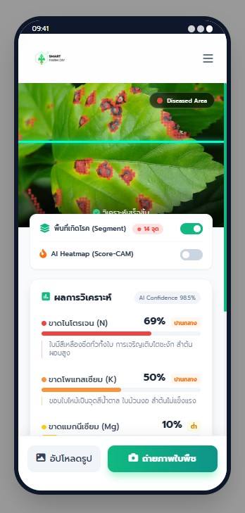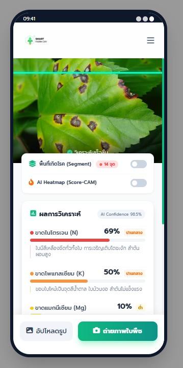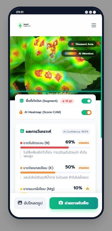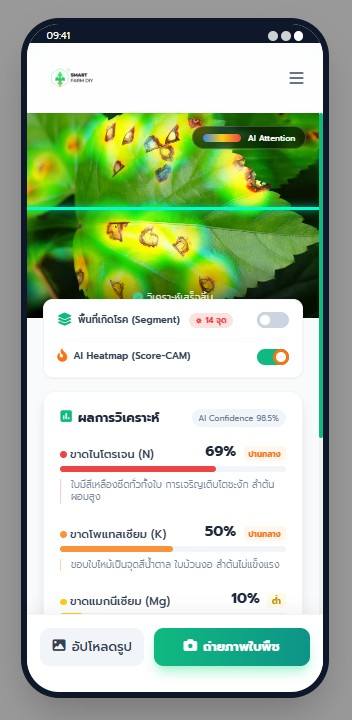 ฟังก์ชัน Score-CAM Heatmap (Class Activation Mapping) เพื่อจำลองการทำงานของ AI ในการ “เพ่งเล็ง” จุดสำคัญบนภาพใบพืช โดยจะแสดงผลในรูปแบบ Heatmap ไล่สี (น้ำเงิน –> เขียว –> เหลือง –> แดง) เพื่อบอกระดับความรุนแรงหรือความมั่นใจของ AI