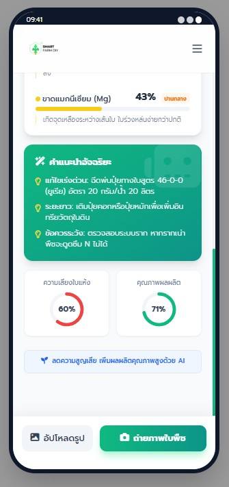 Context-Aware: AI จะรับรู้ผลการวิเคราะห์ปัจจุบัน (เช่น ค่า N, P, K ที่ตรวจพบ) โดยอัตโนมัติ