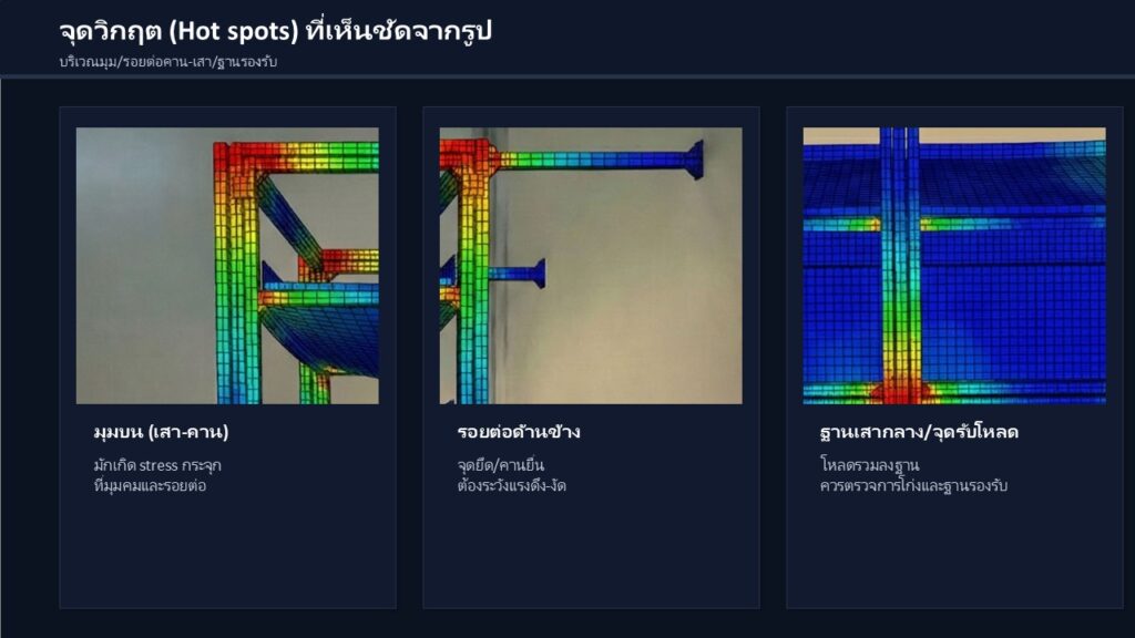 - 🔴 สีแดง → จุดวิกฤต (Critical stress)